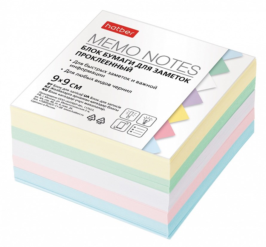 Бумага для заметок ХАТБЕР 9*9*4.5 цветной 5 цвет. на клею в индив. упак. 18 шт. в кор.