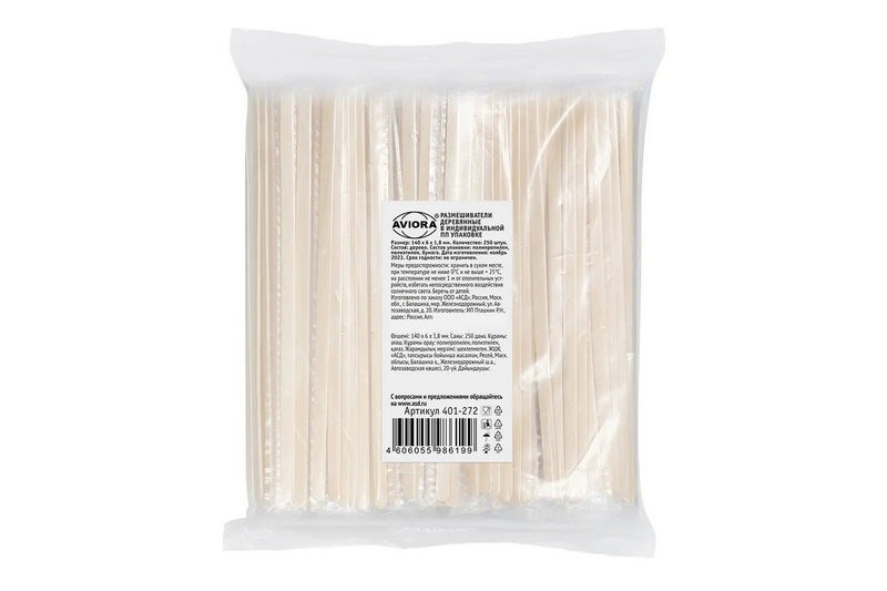 Размешиватель деревянный (20упх250шт) 140мм (20уп) AVIORA в индивид. упак. п/п. уп.
