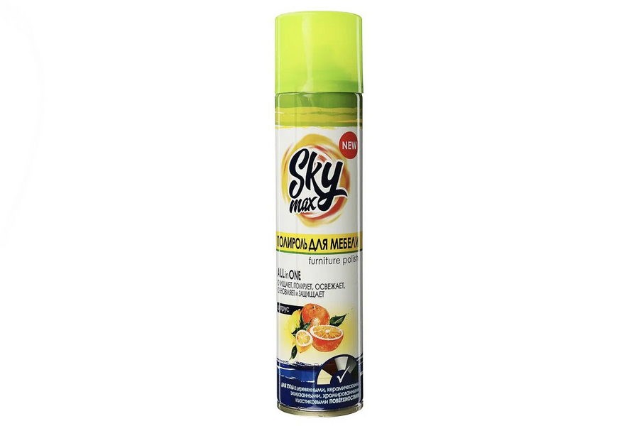 Полироль SKY MAX с легкостью удаляет следы пальцев и грязные пятна с поверхности. Возвращает естественную красоту мебели благодаря содержащемуся в составе натуральному воску. Регулярное применение продлевает срок службы мебели. Предназначен для ухода за мебелью: очищает, полирует, предотвращает налипание пыли, защищает от старения и растрескивания, придаёт обновленный вид и свежий аромат. Подходит для ухода за деревянными, керамическими, эмалированными, хромированными и пластиковыми поверхностями. Аромат - Цитрус.