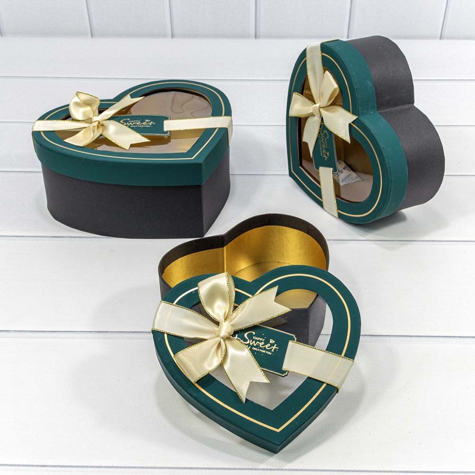 КОРОБКИ "СЕРДЦЕ" С ОКОШКОМ И БАНТОМ ЗЕЛЕНЫЙ № 3