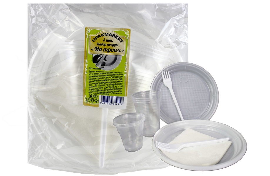 Набор посуды "На троих" состав: стакан - 3 шт, стопка - 3 шт, тарелка 205мм - 3 шт, вилка - 3 шт, салфетка - 3 шт. (20шт в кор) Подходят для сервировки порционных блюд и напитков.