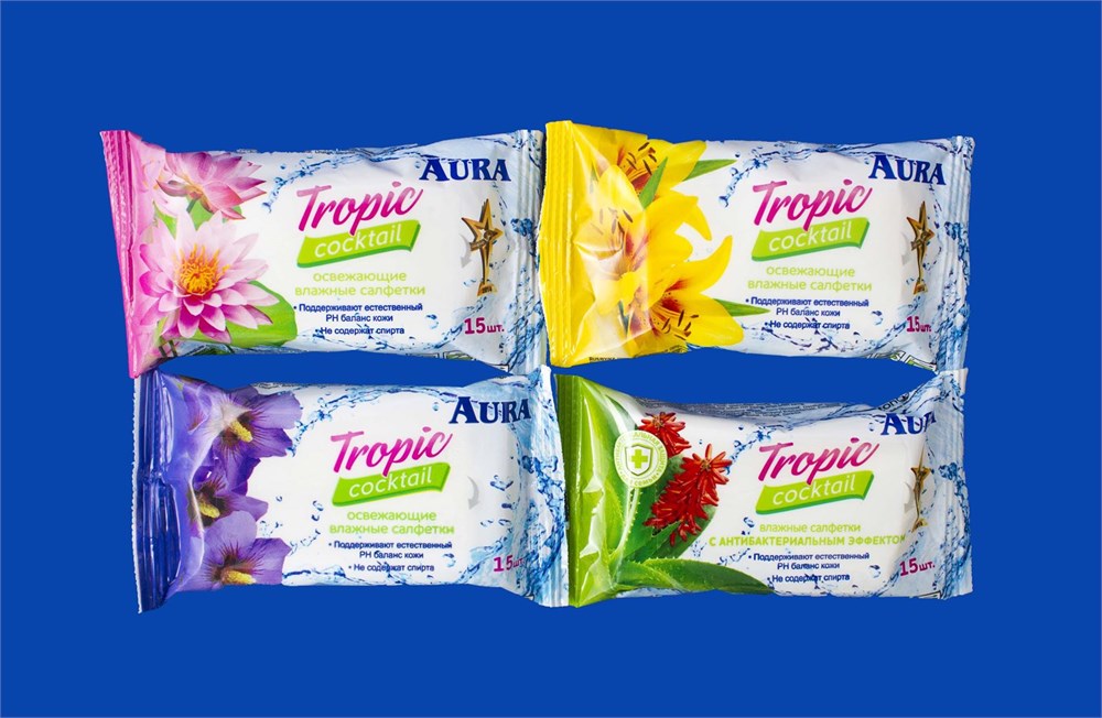 Салфетки влажные АУРА (15шт) Тропик антибактериальные (110уп)
